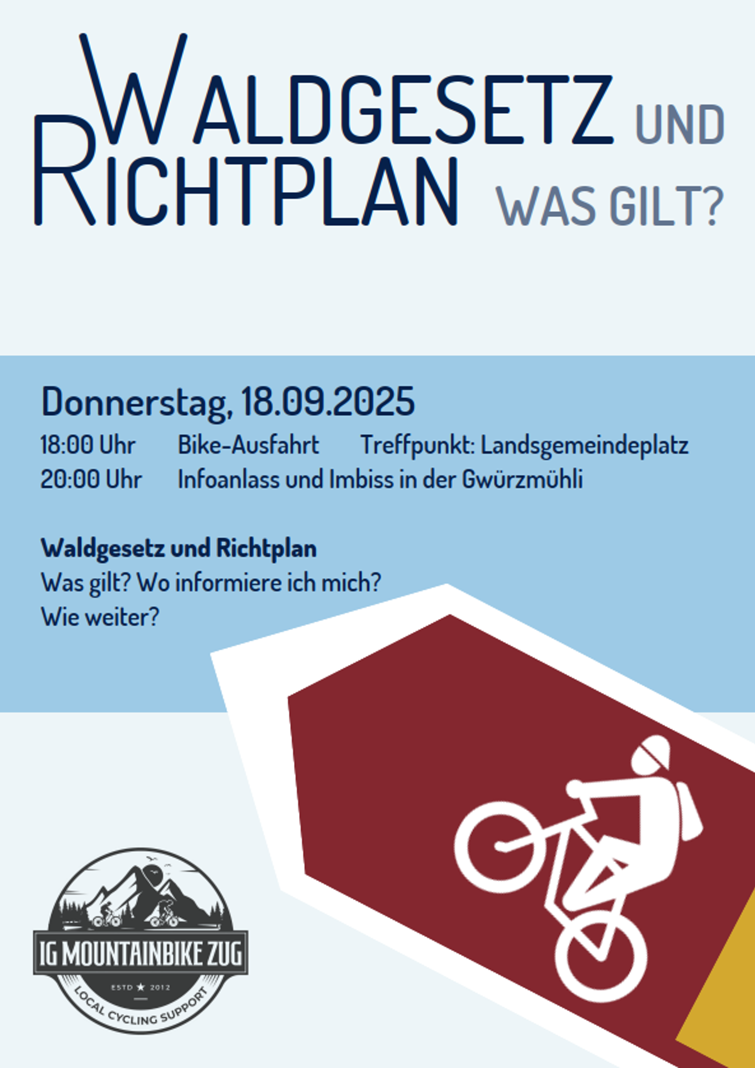 Neben allgemeinen Infos rund um das Thema Biken unter dem neuen Gesetzesmantel werden euch Vertreter vom Amt für Wald und Wild sowie vom Amt für Raum und Verkehr für Fragen und Auskünfte zur Verfügung stehen.