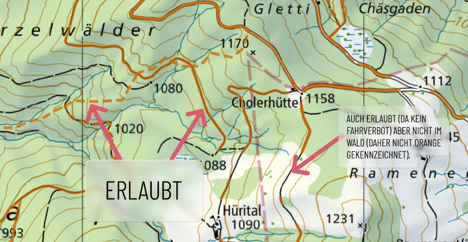 - Ausserhalb des Waldes: Biken wie bisher erlaubt, ausser wo explizit verboten (durch Fahrverbot).